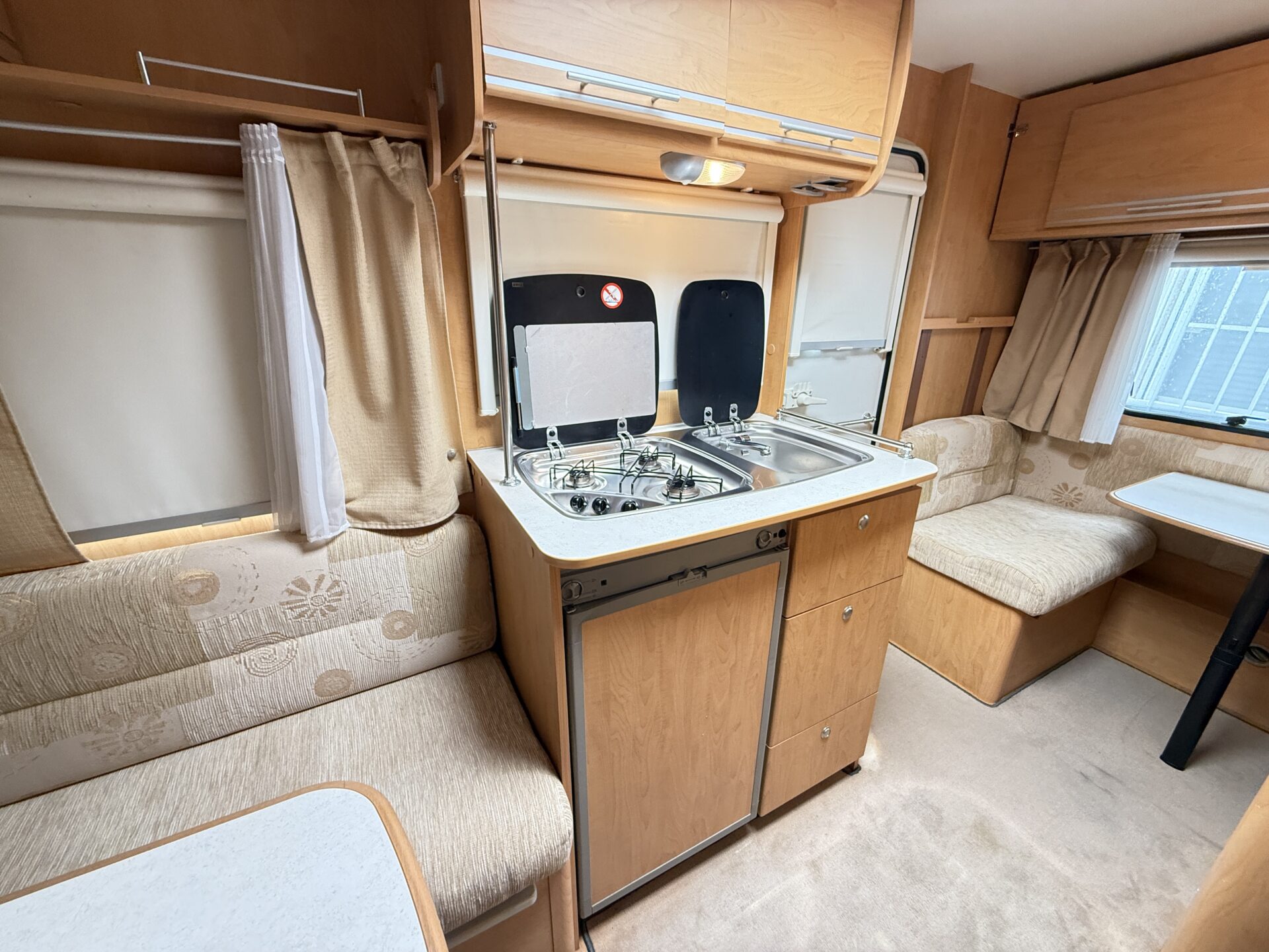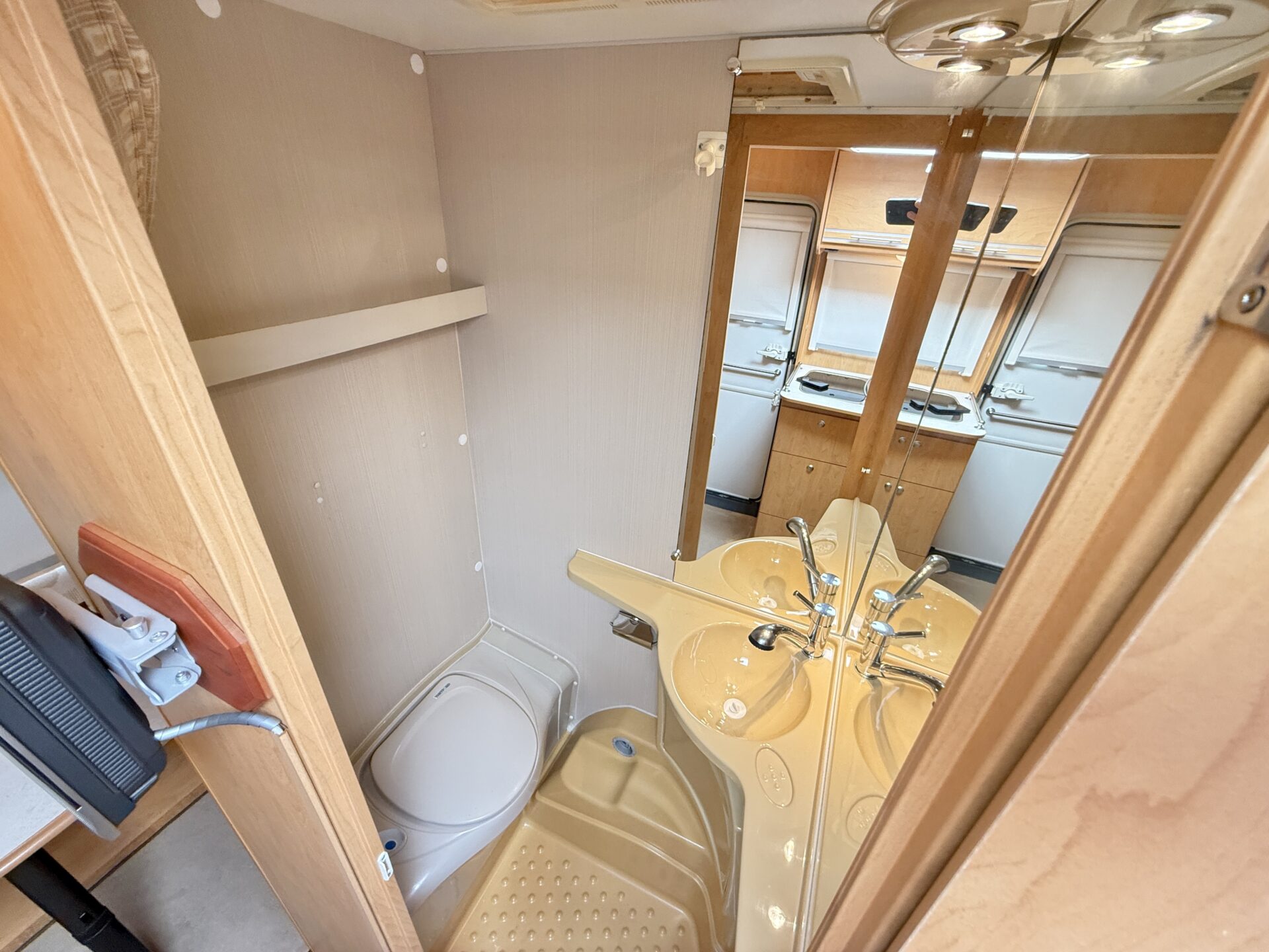 けん引免許不要、FFヒーター、温水ボイラー、冷蔵庫、シンク、3口コンロ、シャワー、トイレ、サイドオーニング、外部電源、リア液晶テレビ、スカイルーフ