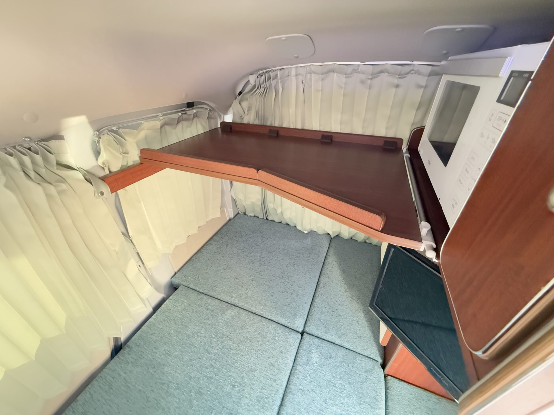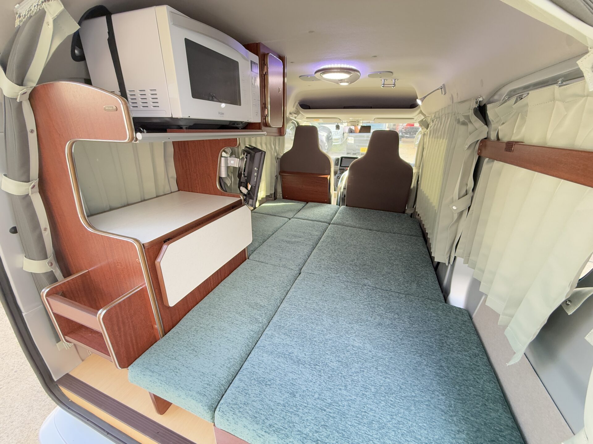 マイクロバカンチェスは乗車定員2名、就寝定員1~2名!😊 後部のベッドスペースが家庭用シングルベッド並みにゆったり設計され、車内で着替えや準備もスムーズ!ペット連れなら愛犬も自由に!🐶 RVパークのドッグランで遊んだ後、ベッドでリラックス。まるく、隠れ家のベッドルームのような居心地で、一人旅の贅沢を味わえます!🏕️
