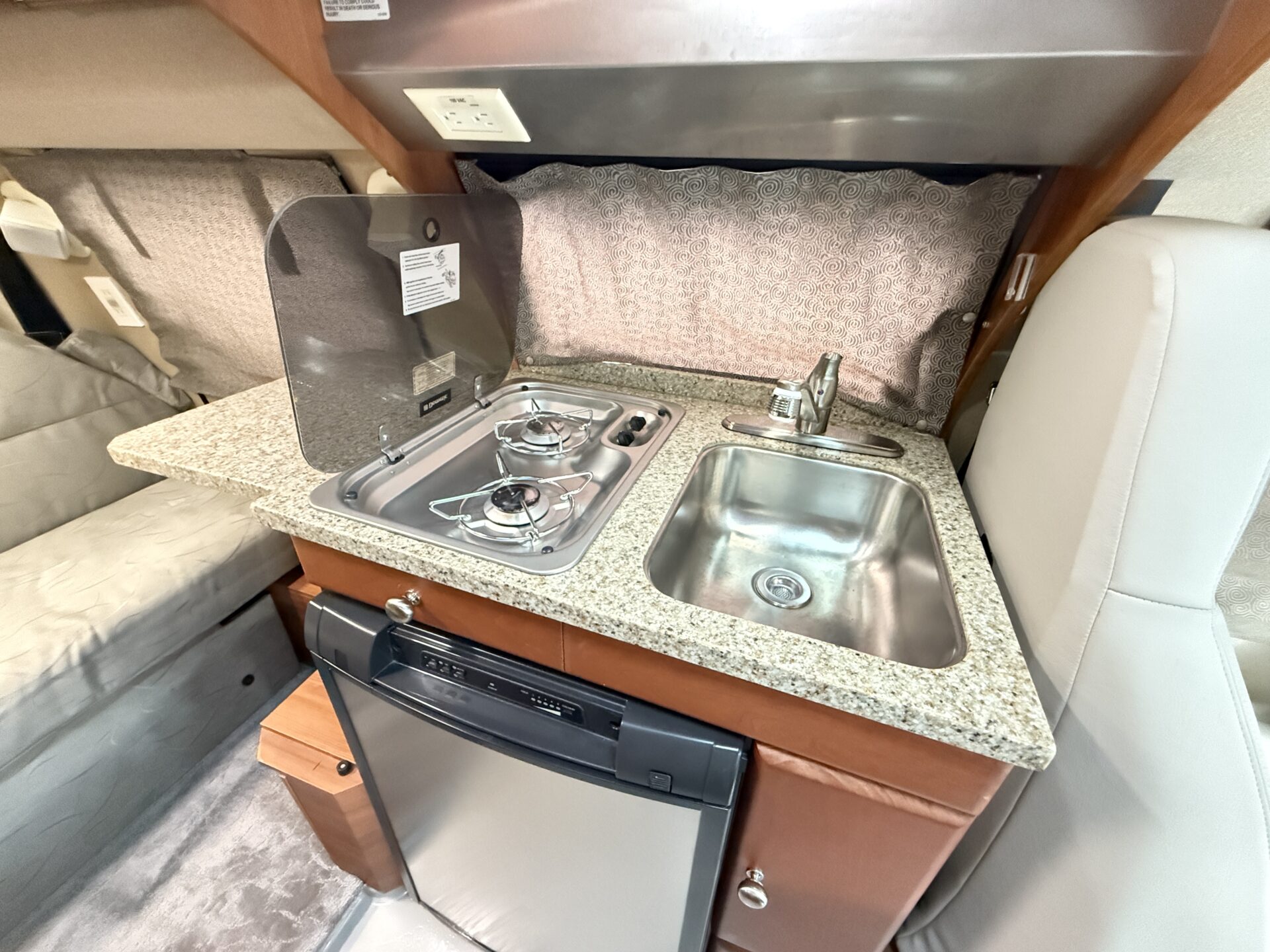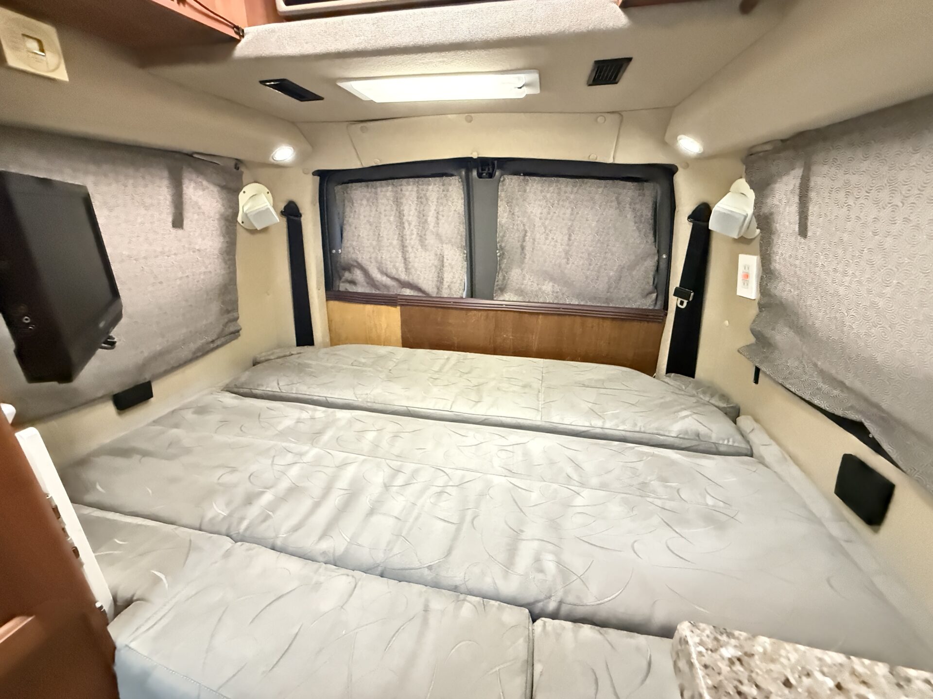170は乗車定員6名、就寝定員3名!😊 後部にキングサイズ相当の常設ベッド、ウェットバスルーム、3バーナーコンロ、冷蔵庫、電子レンジ完備。車内で立ってシャワーも浴びられます!ペット連れなら愛犬も広々。RVパークの電源を使えば、エアコンで夏も快適!まるで走るアパートメントのような居心地!🏕️