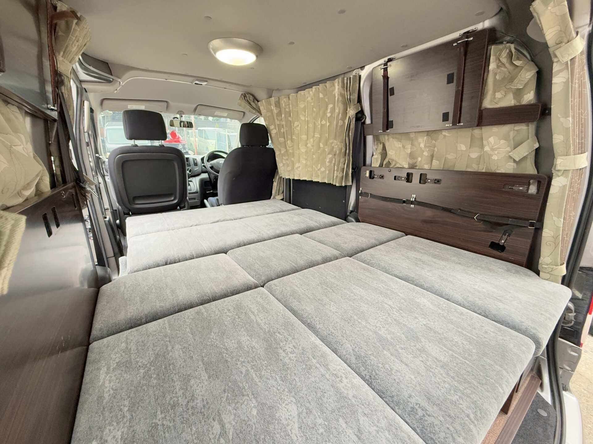 コンパクトバカンチェスは後席シートでくつろぎタイム、ベッド展開でゆったり就寝。安心感が高くペット連れなら愛犬も落ち着いて過ごせます!🐶