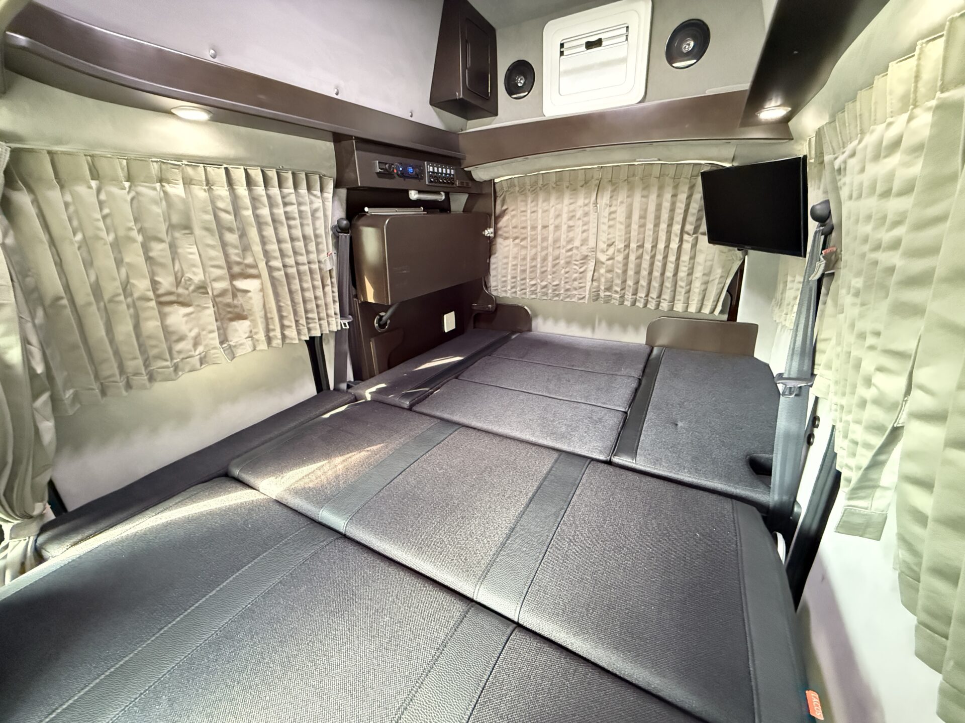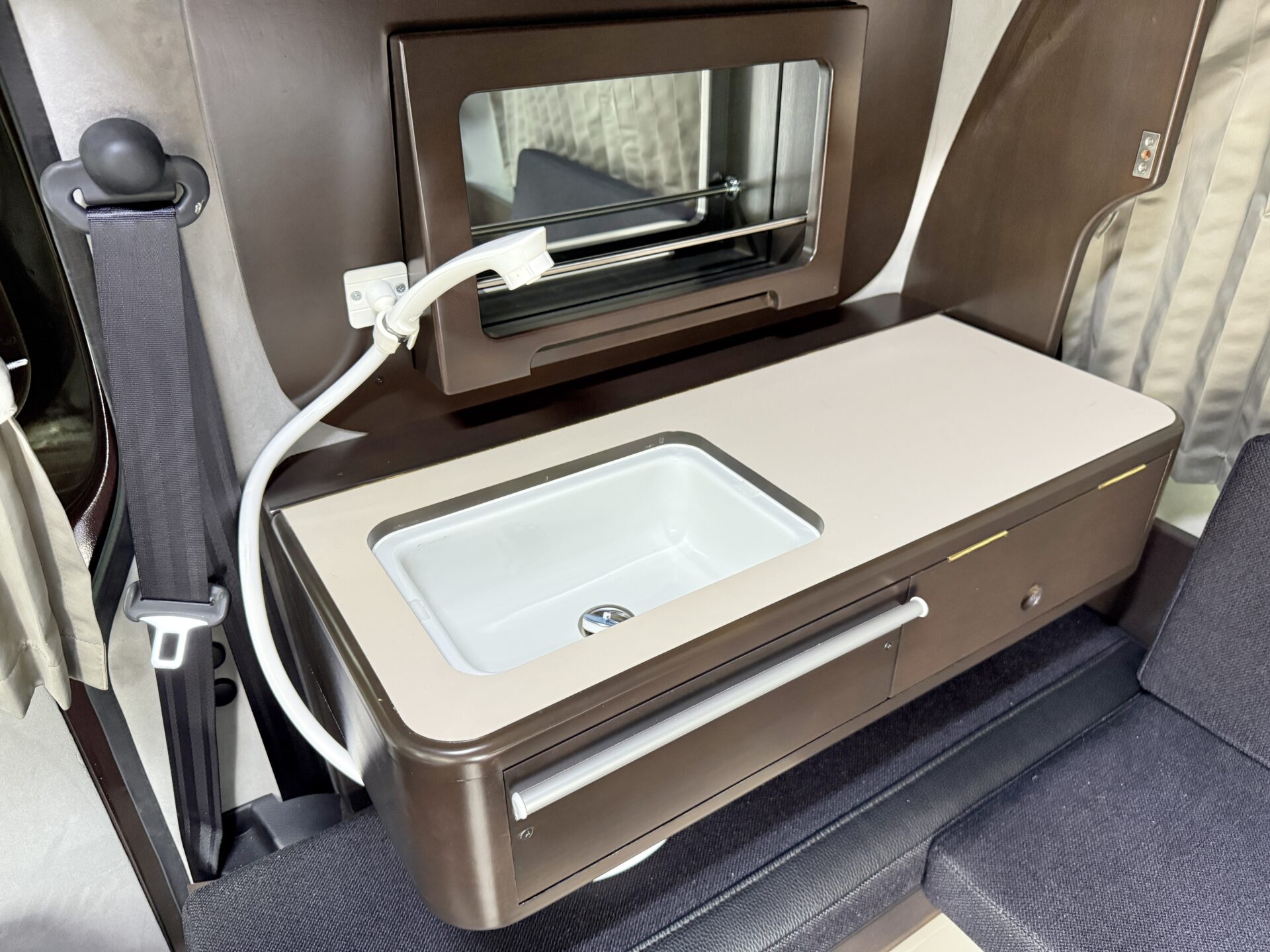 NVジャックはシンク、テレビ、FFヒーターを搭載したコンパクト内装!🍳 ペット連れならエアコン(オプション)で車内を快適に保ち、愛犬の暑さ対策もバッチリ。FFヒーターを使えば、冬場の車中泊も快適に。年中車中泊にお使いいただけます!😉