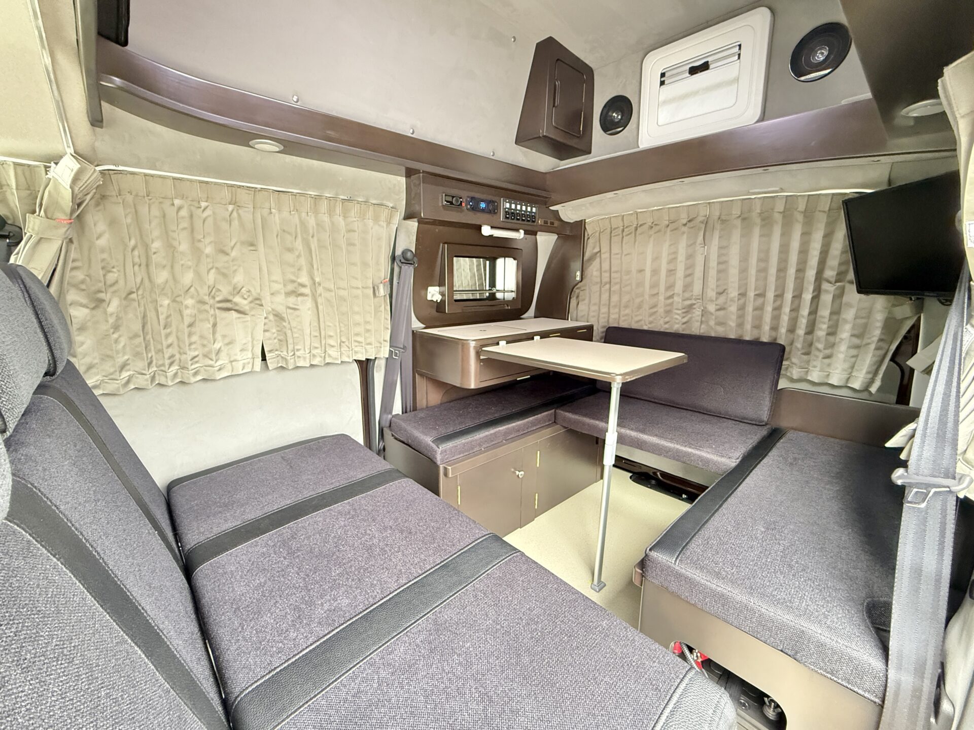 NVジャックはシンク、テレビ、FFヒーターを搭載したコンパクト内装!🍳 ペット連れならエアコン(オプション)で車内を快適に保ち、愛犬の暑さ対策もバッチリ。FFヒーターを使えば、冬場の車中泊も快適に。年中車中泊にお使いいただけます!😉
