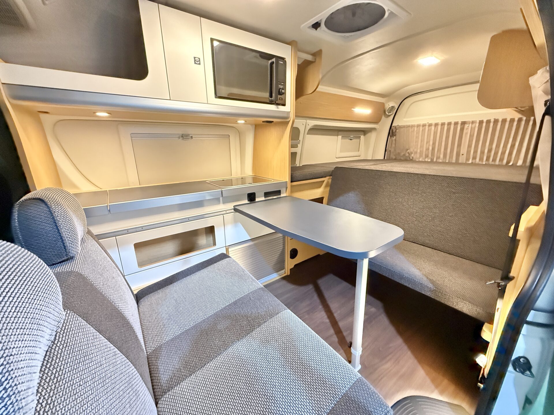 今回買取したバレイアは乗車定員4名、就寝定員4名!😊 スーパーロングのボディで対面ダイネットと常設ベッドがゆったり配置され、室内高で車内で立って着替えや準備がラクラク!ペット連れなら愛犬も広々空間で自由に!🐶 RVパークの温泉でリフレッシュ後、ダイネットで家族リビングタイム。まるでモダンアパートのリビングのような居心地で、旅が自宅の延長に!🏕️