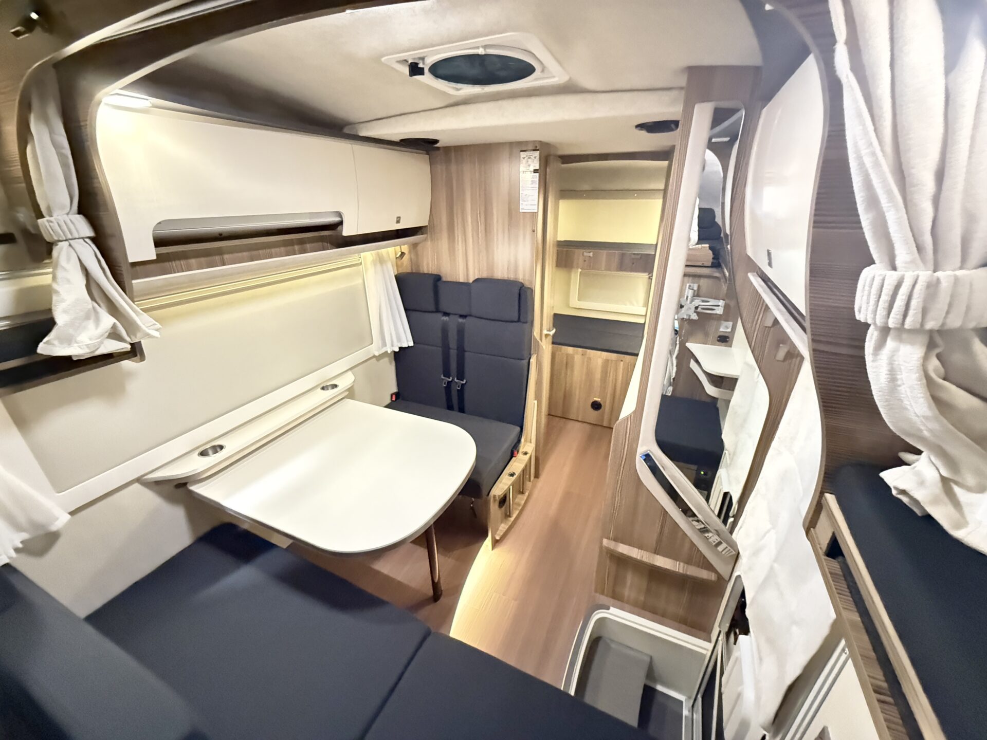バンクベッド(運転席上)と後方の常設2段ベッドで、合計6人就寝が可能!