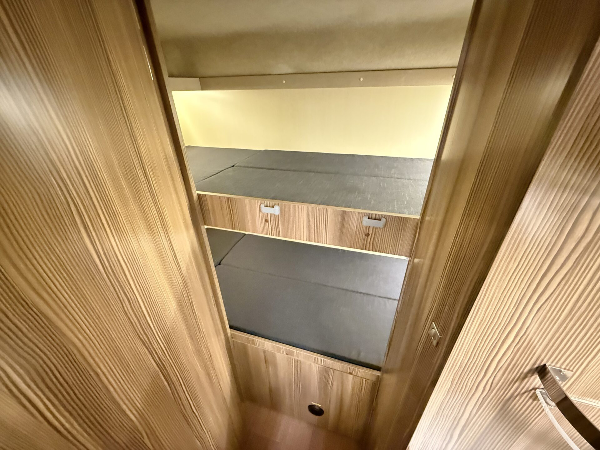 バンクベッドは大人2人、後方2段ベッドは子供2人+大人1人くらいまで対応でき、ベッドメイク不要でいつでも寝られる。
