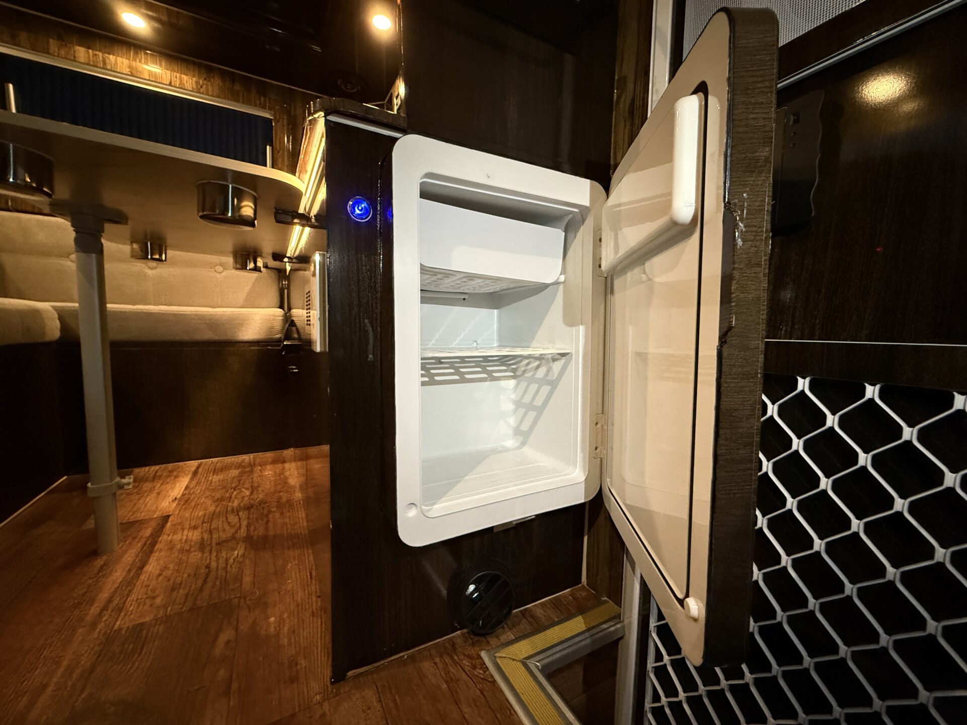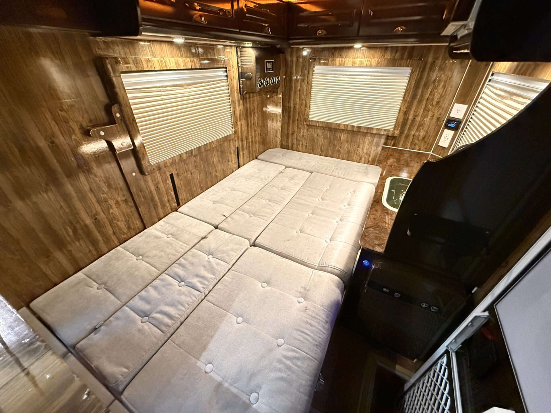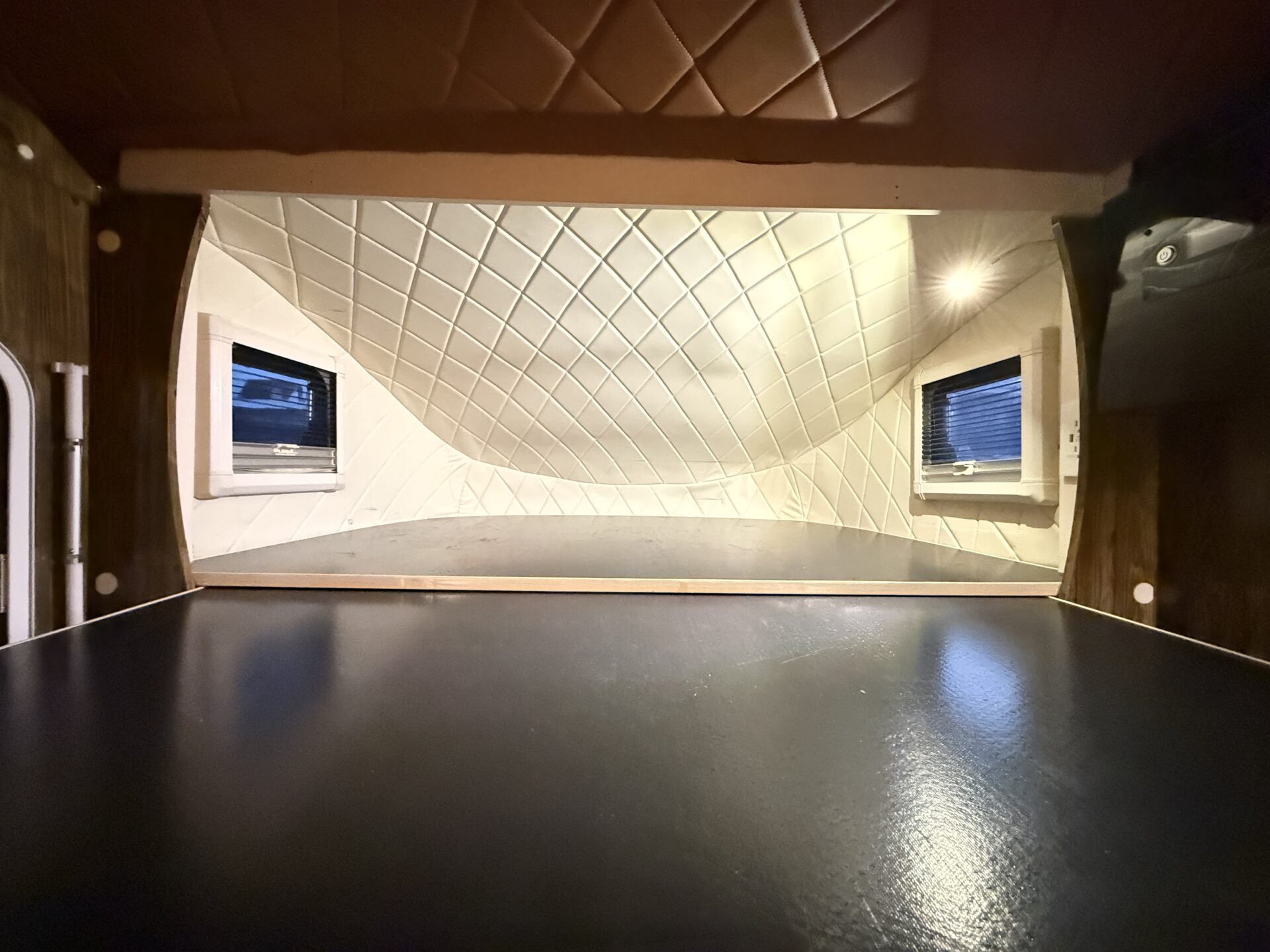 RVパークに着いたらすぐリラックスタイム。まるで小さな秘密基地の寝室で、旅の準備が楽チン!