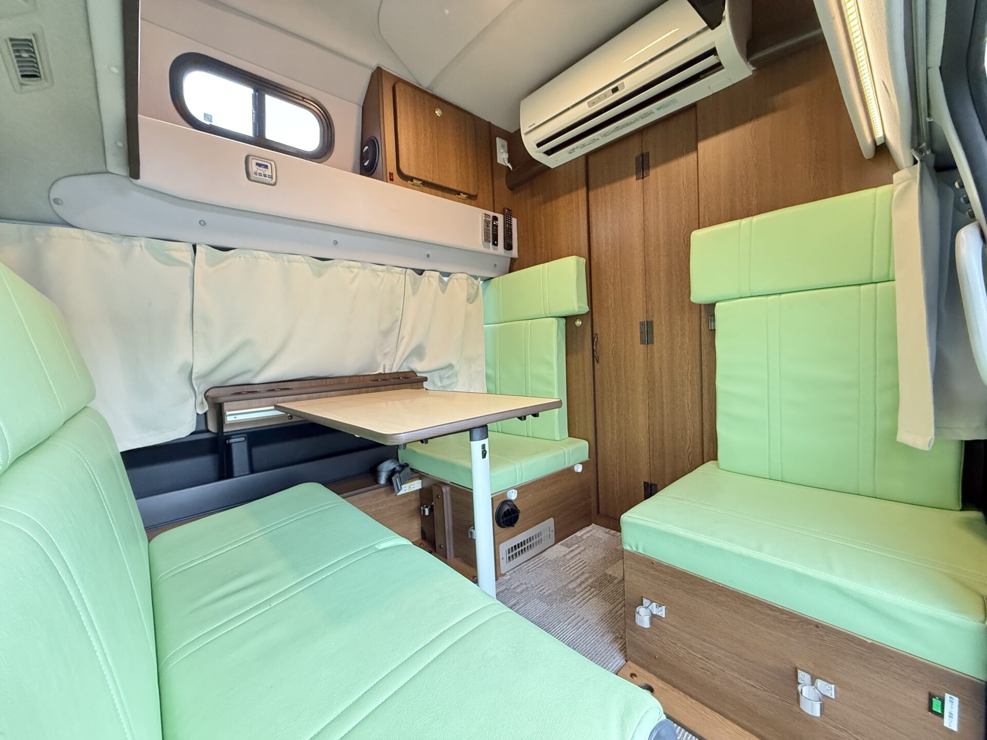 対面ダイネットと常設バンクベッドで家族みんながゆったり、室内高で車内で立って準備も楽々。