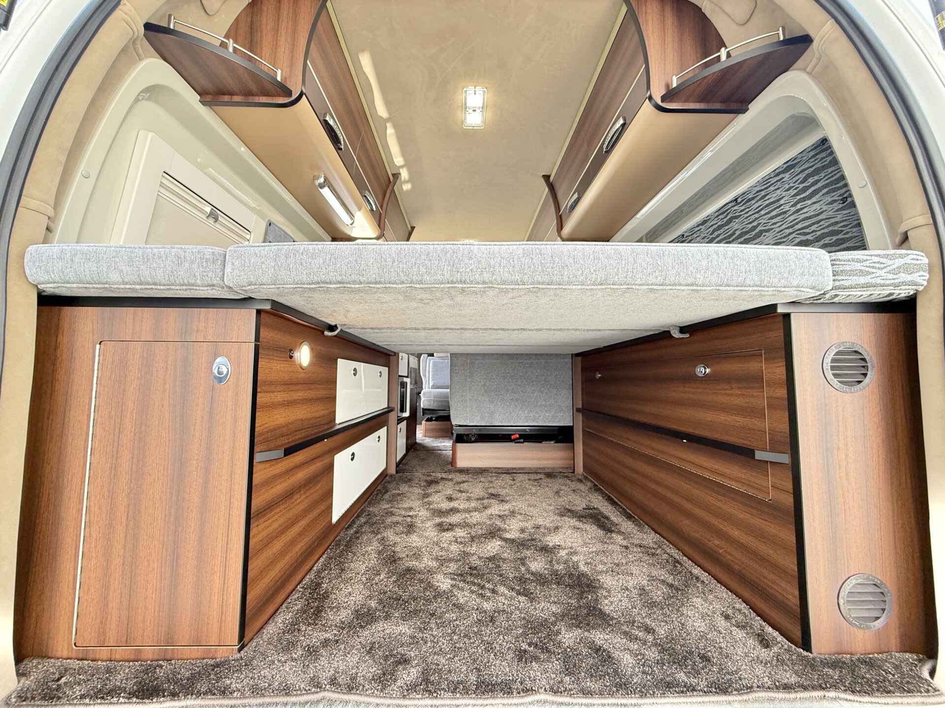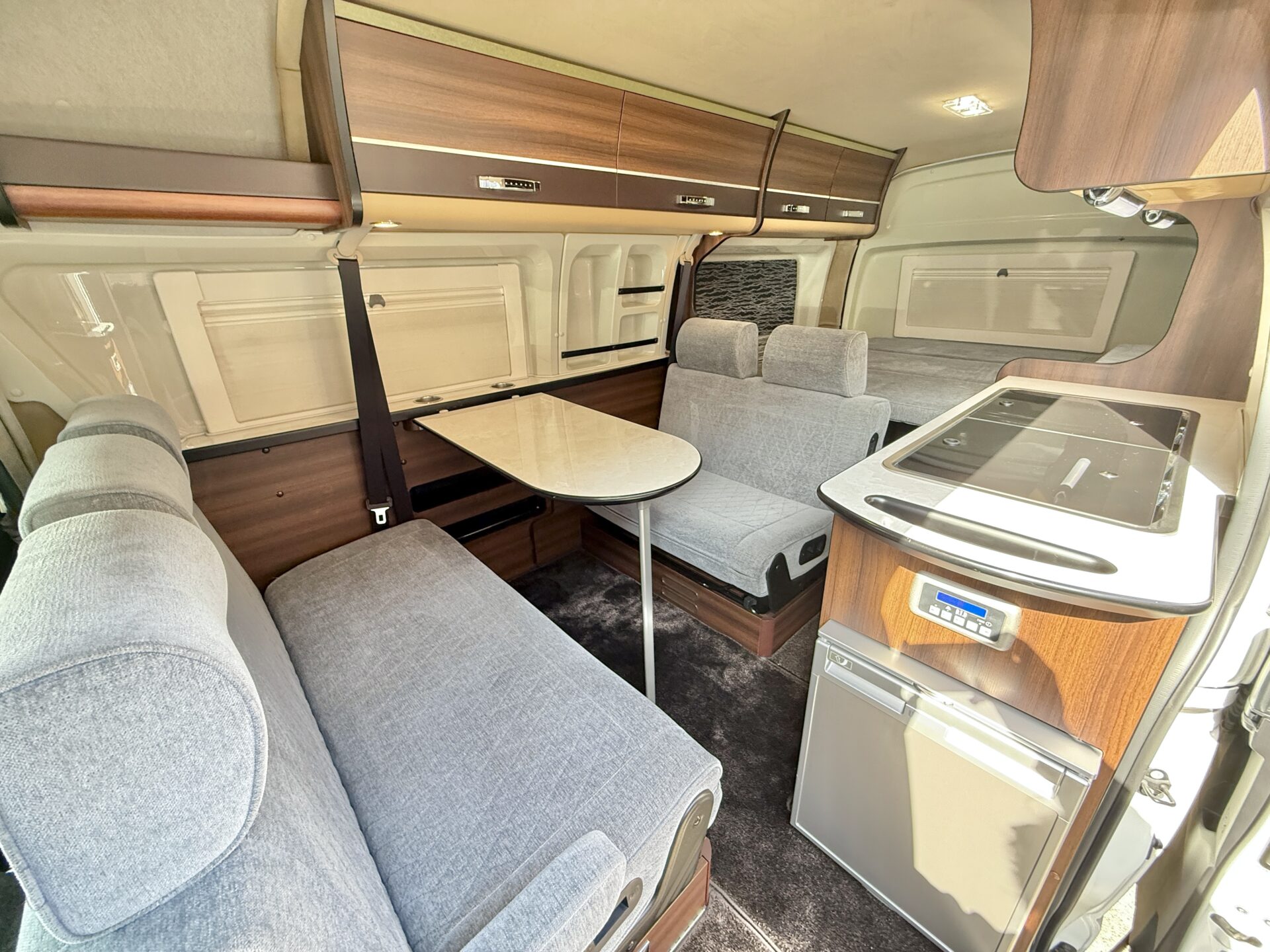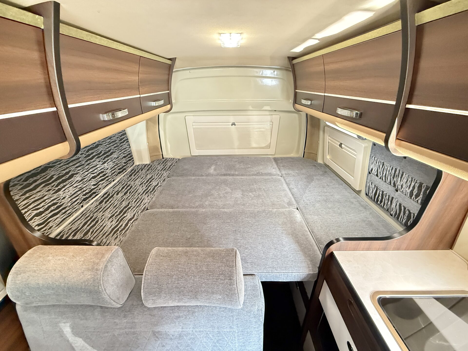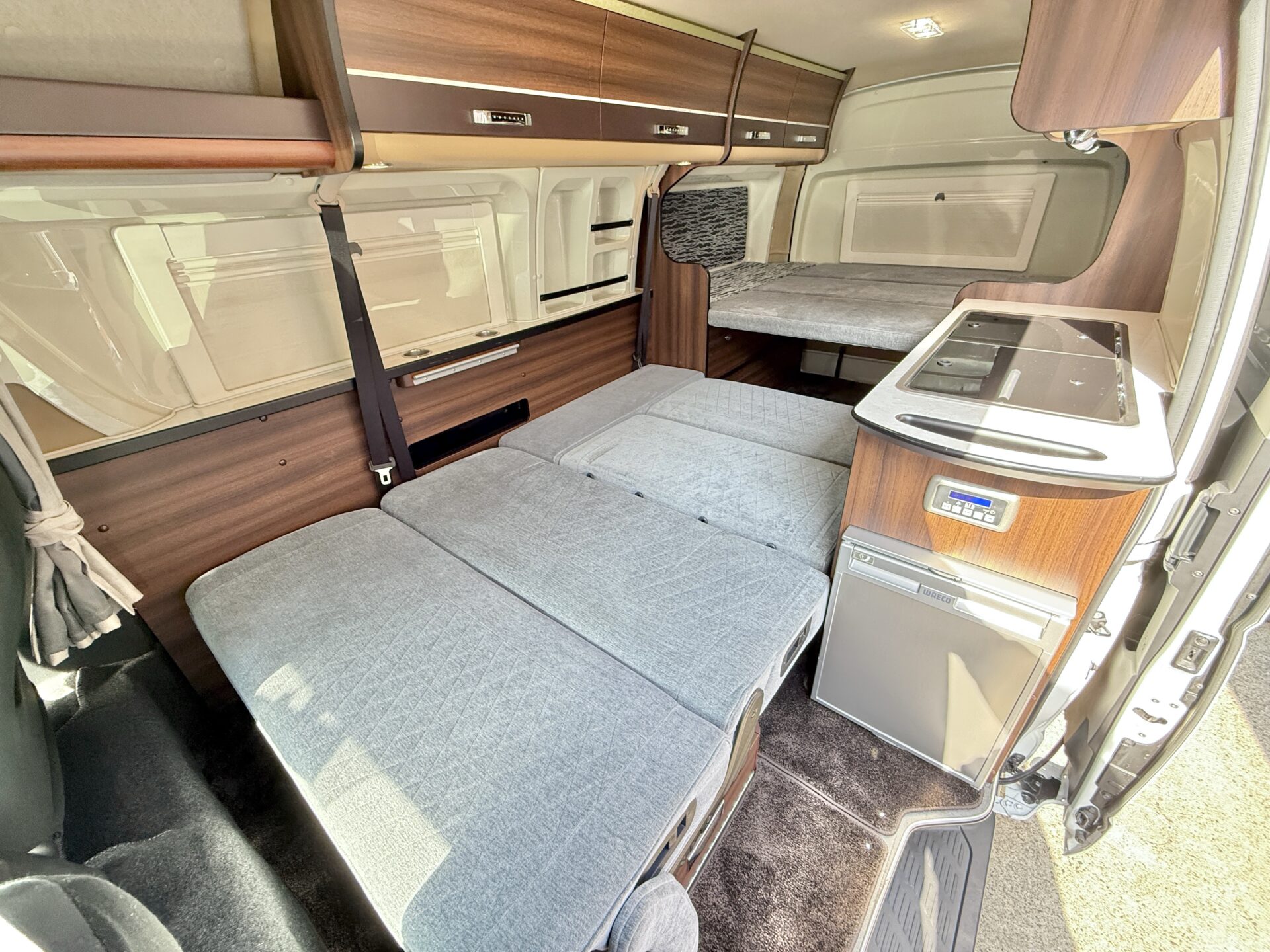 常設ダブルベッドと対面ダイネットで家族みんながゆったりくつろげ、ハイルーフの室内高で車内で立って着替えや準備がラクラク。ペット連れなら愛犬も広々空間で自由に動き回れます!🐶