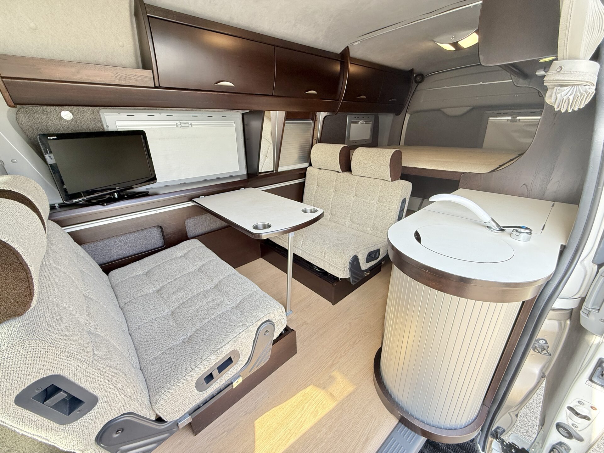 後席テレビ搭載で、長距離移動中も家族で映画や動画を楽しめます! ダイネットでくつろぎながらテレビを見る時間は、まるで高級リゾートのラウンジ。 ペット連れなら愛犬も一緒にリラックス。RVパークで夜更かし映画鑑賞もおすすめ!📺