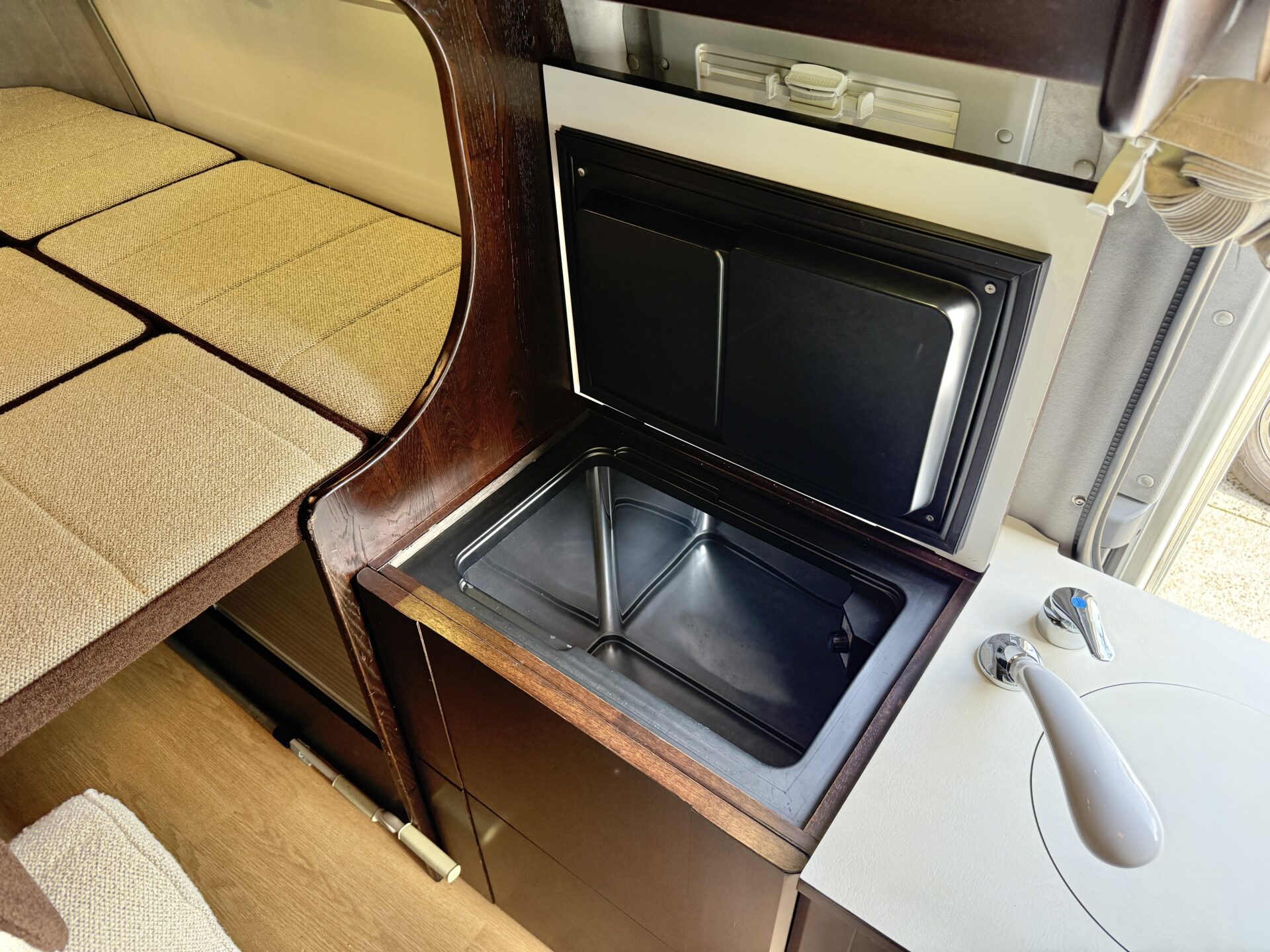 冷蔵庫とシンクが搭載されているので、旅先の地元食材を冷やして保存したり、簡単な調理が車内でできます! 朝は冷蔵庫から取り出したフルーツでフレッシュなスタート、夜はシンクで洗い物も楽々。 ペット連れなら愛犬のフードやおやつも冷蔵庫で管理できて安心。まるで高級リゾートのキッチンのような便利さで、旅の食事がもっと楽しく!🍳