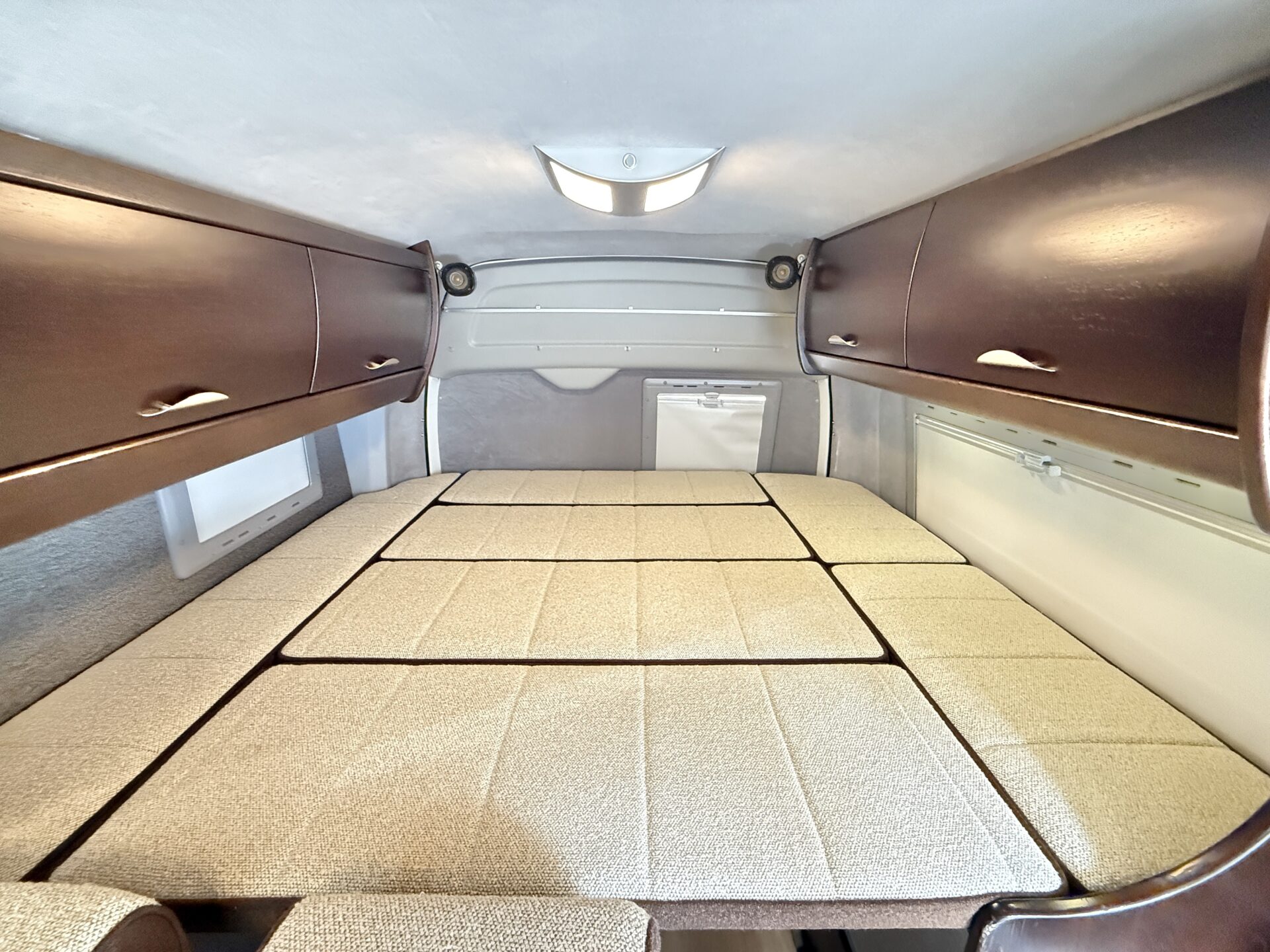 乗車定員7名、就寝定員4名! 対面ダイネットと常設ベッドで家族みんながゆったりくつろげ、室内高で車内で立って準備も楽々。 ペット連れなら愛犬も広々空間でゴロゴロ!RVパークのドッグランで遊んだ後、ダイネットでくつろぎ。まるで高級リゾートのリビングのような空間で、家族の絆が深まります!😊