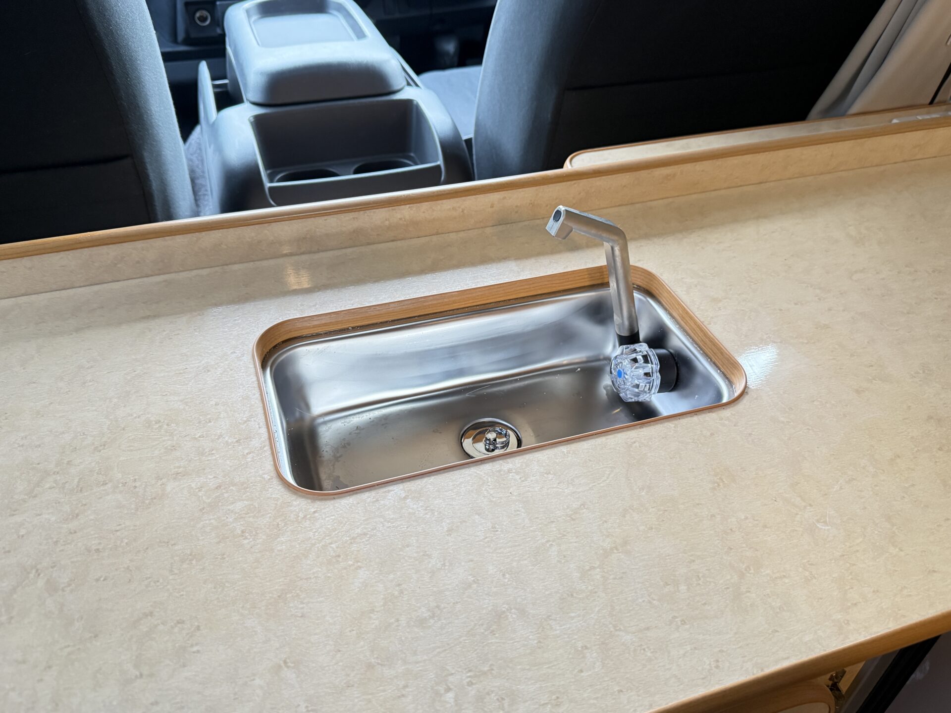 シンクと冷蔵庫が標準で、旅先の地元食材を冷やして保存したり、簡単な調理もOK!