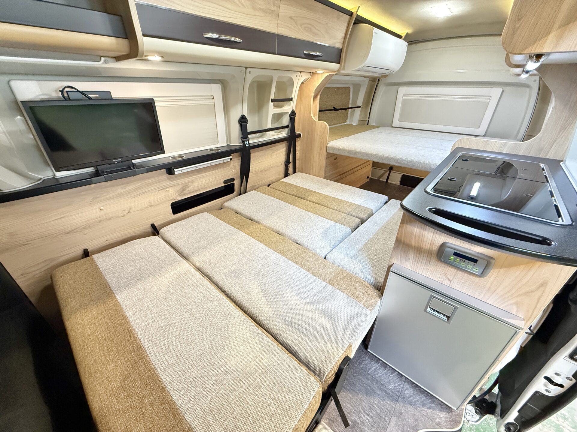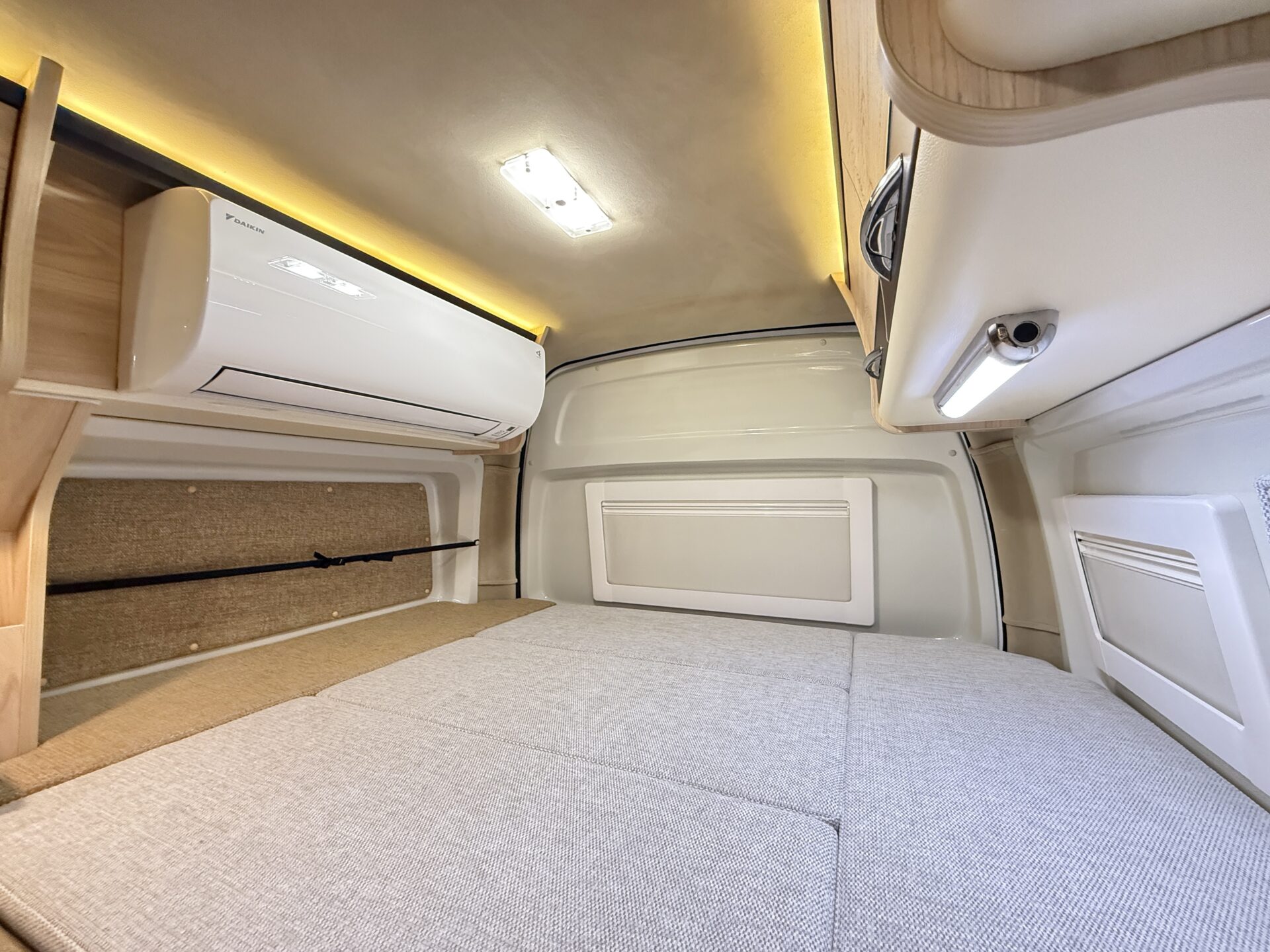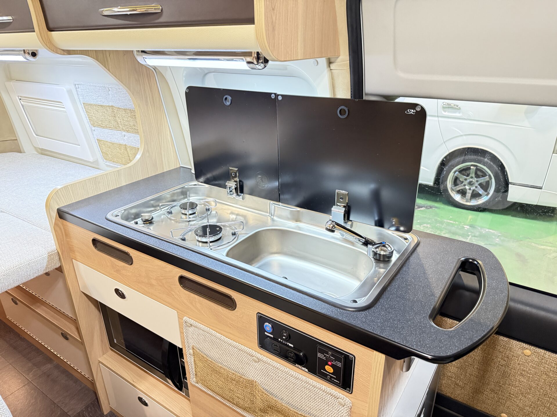家庭用エアコンとFFヒーターのダブル装備で、季節を問わず車内が快適! 夏はエアコンで涼しく、冬はFFヒーターでポカポカ。ペット連れなら愛犬の熱中症・寒さ対策も万全。 RVパークの電源を使えばエアコン24時間稼働、まるでラボのクリーンルームのような温度管理でぐっすり寝られます!❄️☀️
