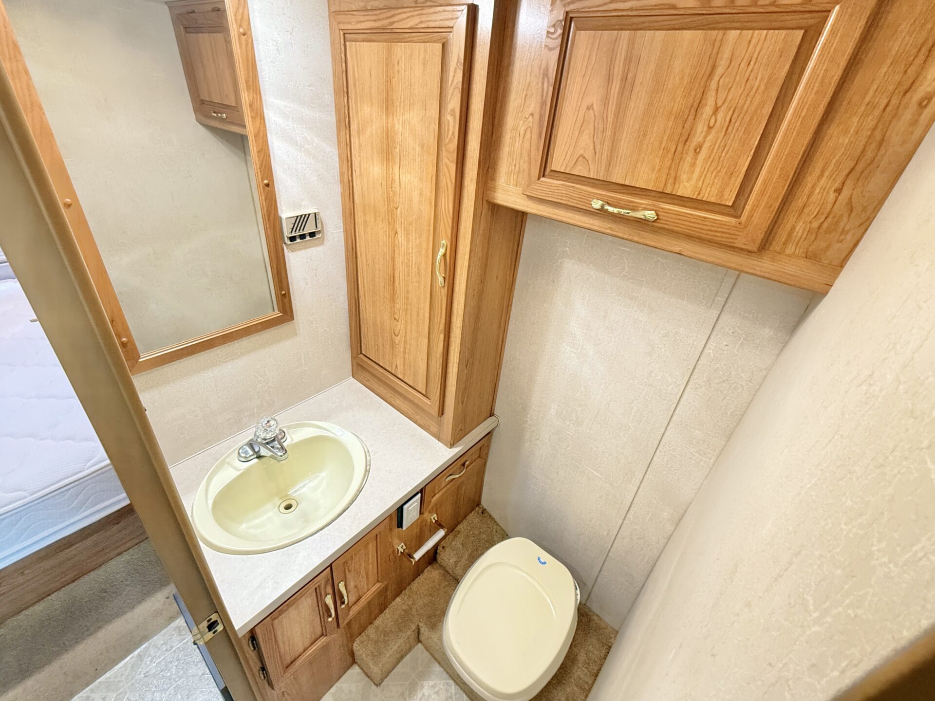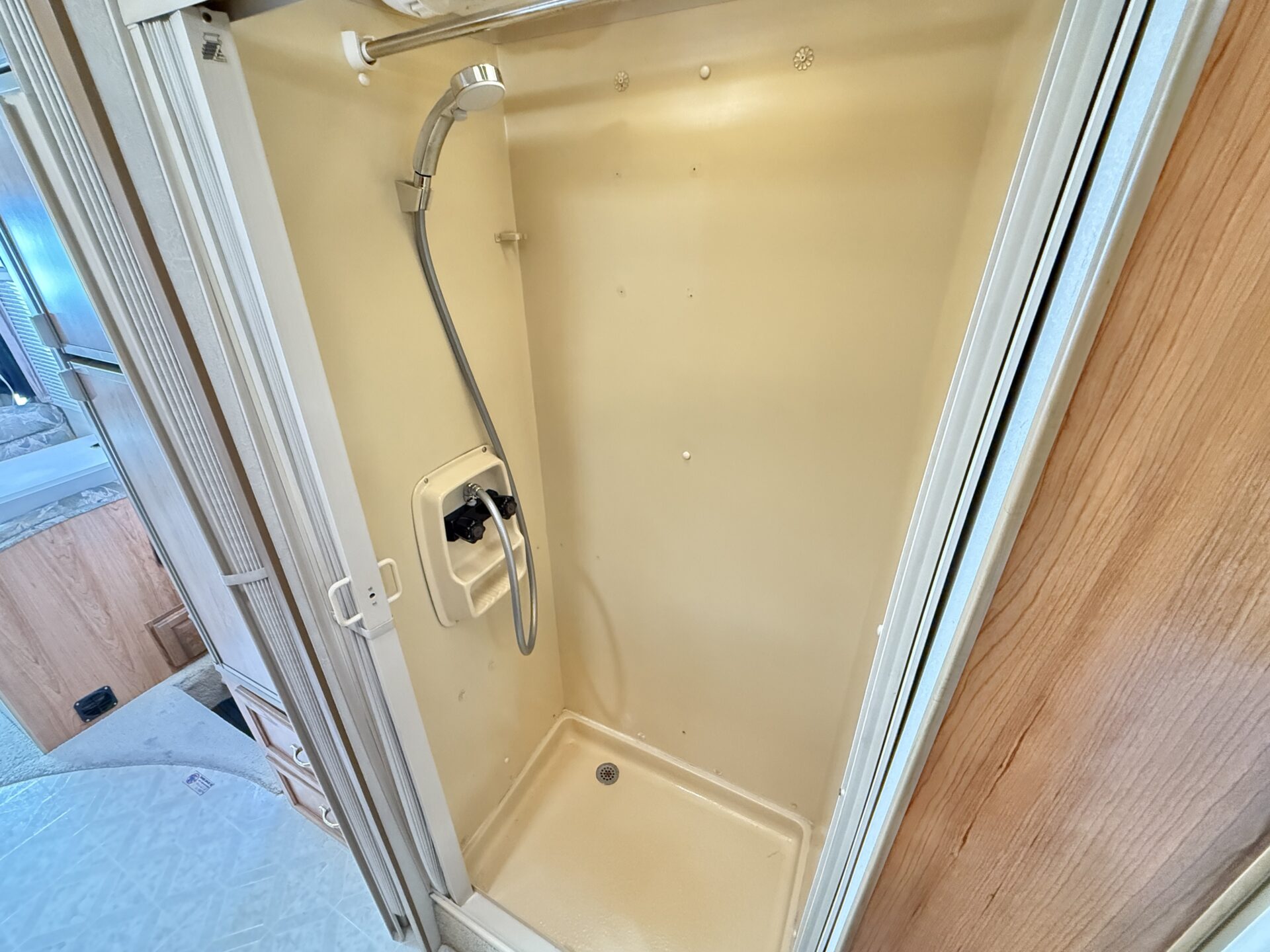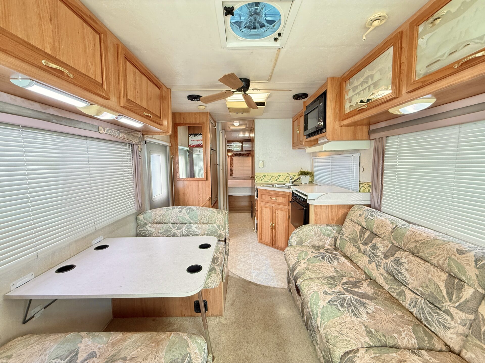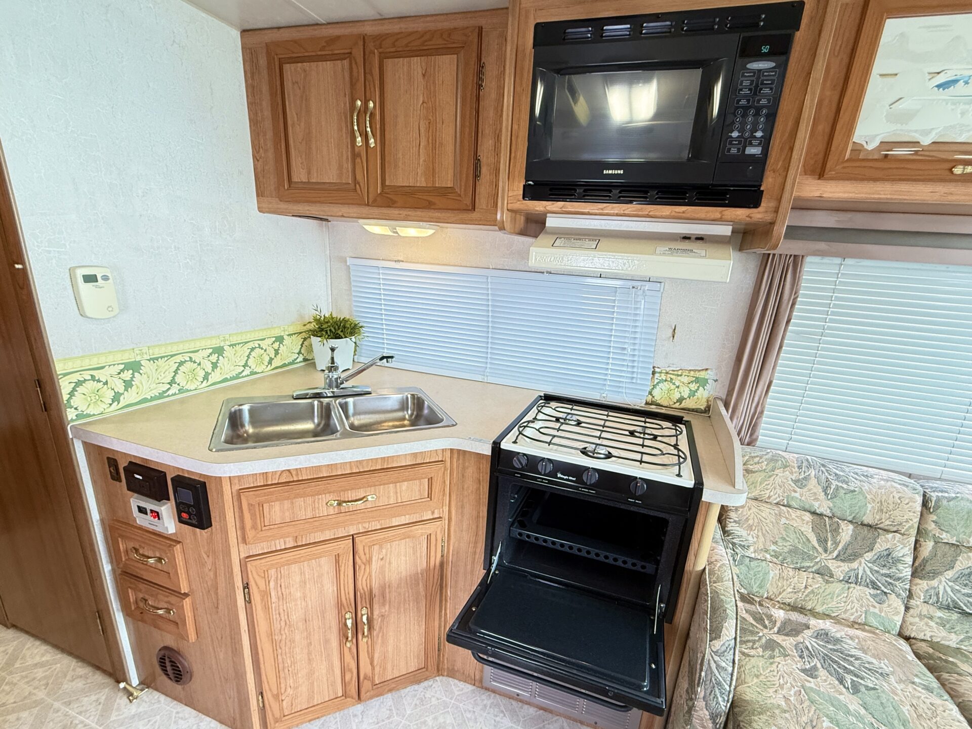 シンクと大型冷蔵庫、電子レンジを備えたキッチンで、旅先の地元食材を活かした料理が簡単に! RVパークの電源を使えば、電子レンジで温かい食事もすぐ準備可能。 ペット連れなら愛犬の食事も管理しやすく、まるで高級別荘のキッチンのような便利さで、旅の食事が楽しみになります!🍳