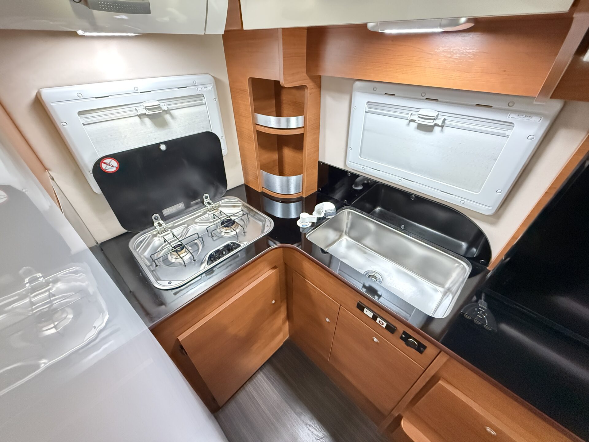 2口コンロとシンクが付いているので、旅先の地元食材で簡単な料理が車内で可能! 朝はコーヒーを淹れて、夜は温かいおかずを作って家族やペットとシェア。 RVパークの電源を使えば、コンロで本格的に調理もできて、旅の食事がもっと楽しくなります!🍳