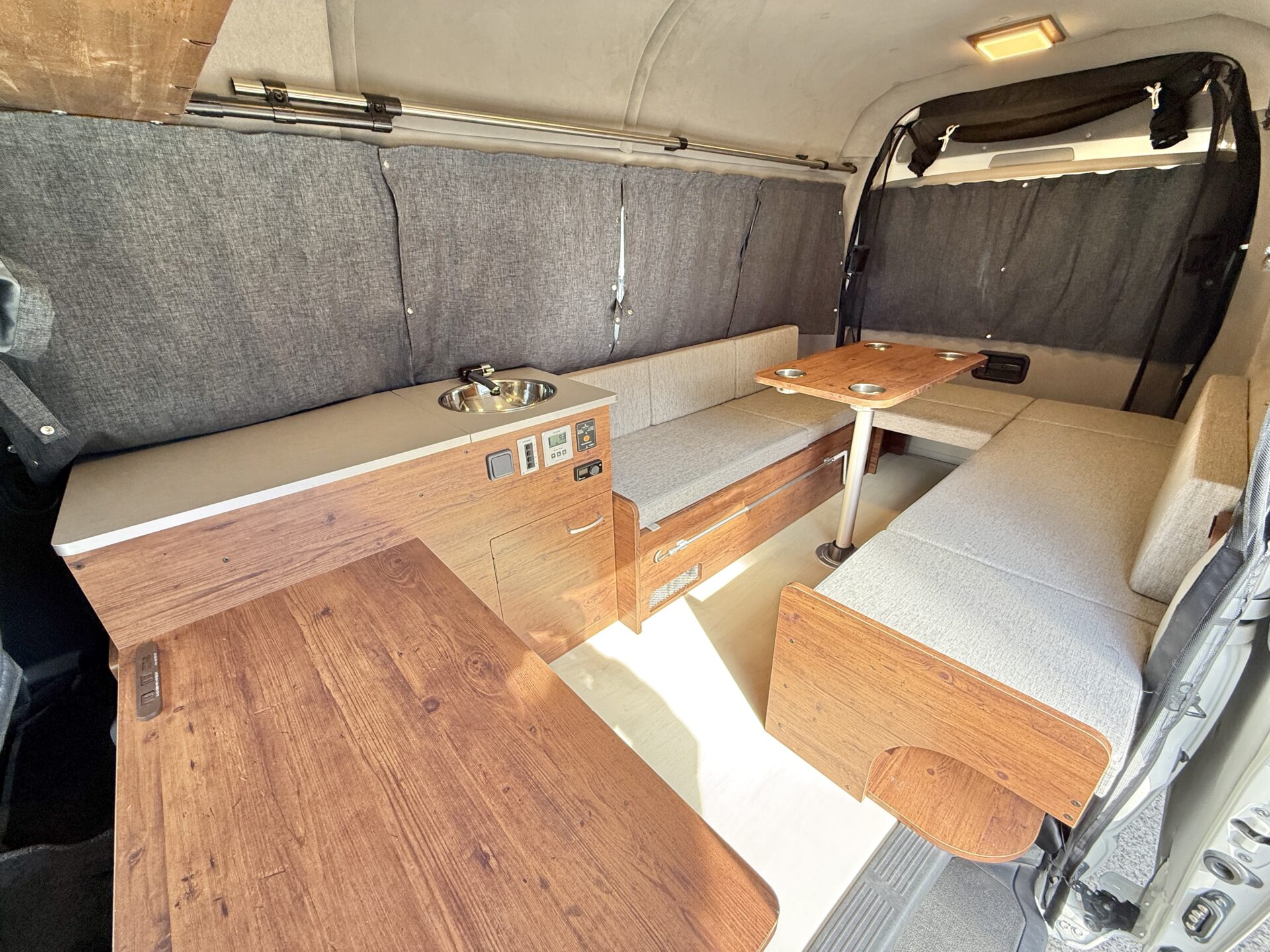 シンクと冷蔵庫が搭載されているので、旅先の地元食材を冷やして保存したり、簡単な調理が車内でできます! 朝は冷蔵庫から取り出したフルーツでフレッシュなスタート、夜はシンクで洗い物も楽々。 ペット連れなら愛犬のフードやおやつも冷蔵庫で管理できて安心。まるで海辺のコテージのキッチンのような便利さで、旅の食事がもっと楽しく!🍳